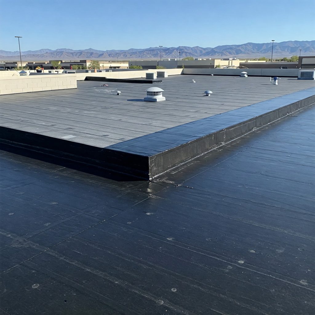 EPDM is a synthetic rubber membrane known for its long lifespan and flexibility. It performs well across a wide range of temperatures, making it suitable for the hot days and cooler desert nights of Las Vegas. Its black color, however, absorbs a lot of heat, which can drive up cooling costs in the summer. That can be offset with a reflective coating. EPDM is durable and easy to repair but can be vulnerable to punctures from foot traffic or sharp debris. In very dry climates, long-term shrinkage may occur if not properly installed.